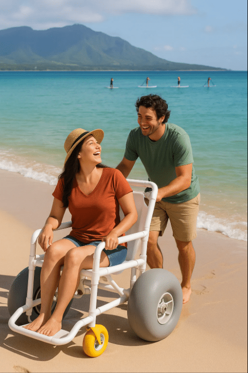 Wide-tire beach wheelchair designed for sand, grass, and uneven outdoor terrain. Provides stable, comfortable mobility for beach days and outdoor events.