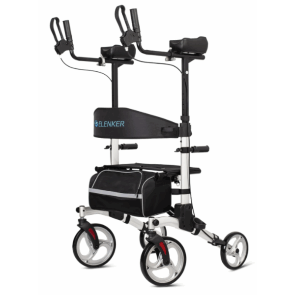 Our Upright Rollator helps users walk with improved posture by using elevated forearm supports instead of standard low handles. This design reduces pressure on the back and shoulders while increasing stability and control. Large wheels navigate various surfaces with ease, and the supportive frame includes hand brakes, a comfortable folding seat, and a storage basket. Ideal for users who struggle with leaning or stooping while walking.